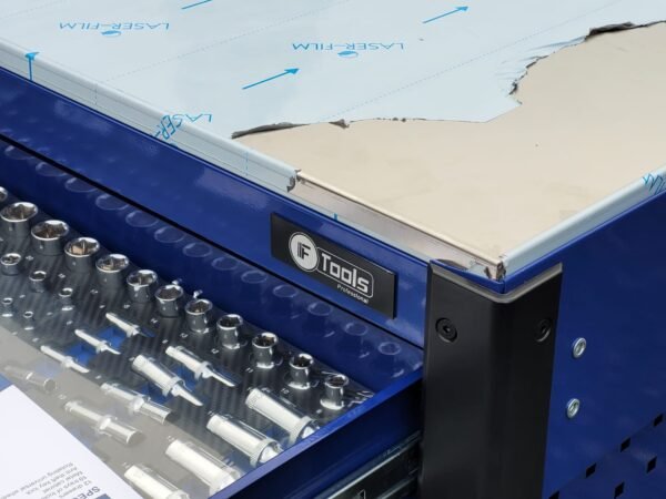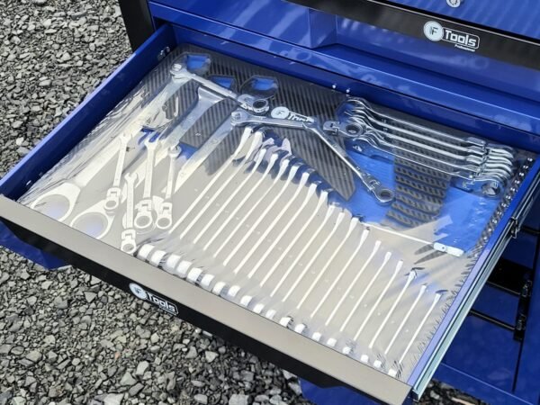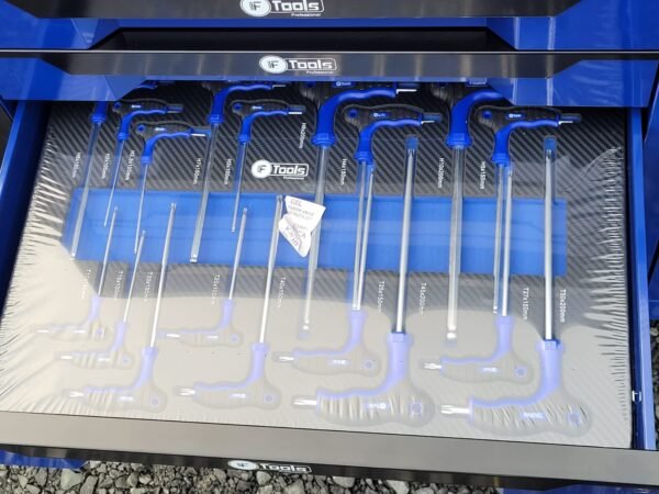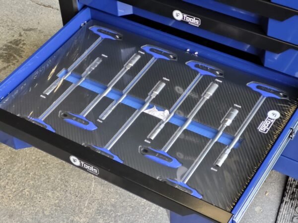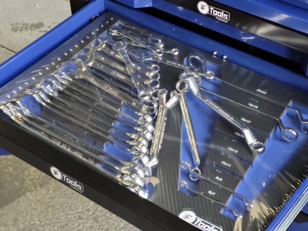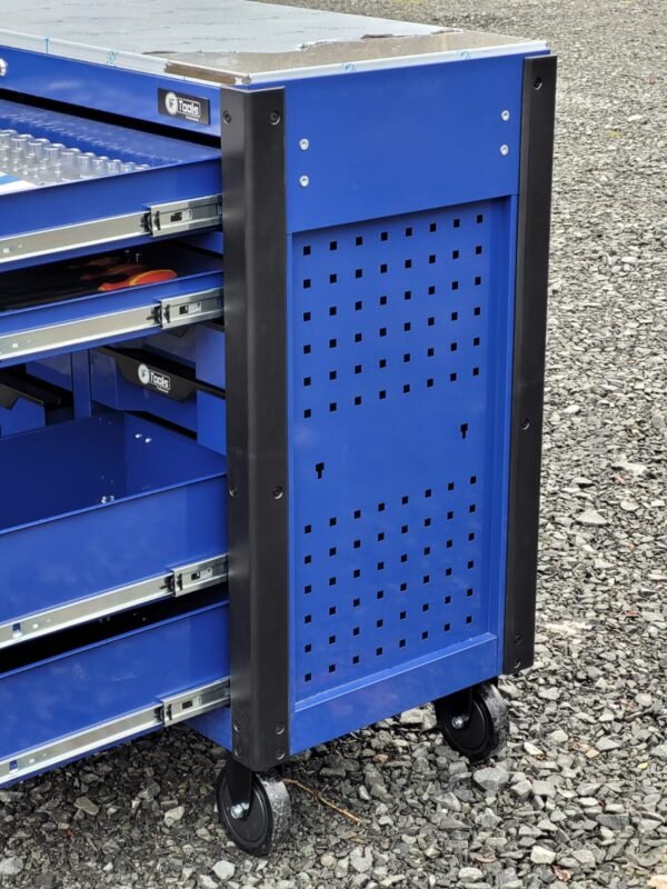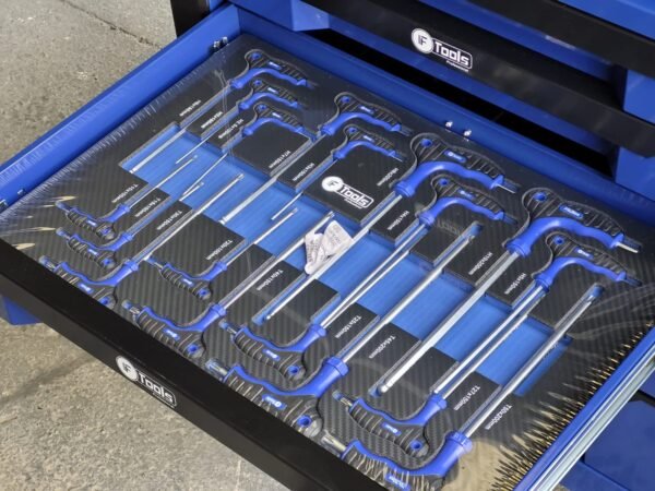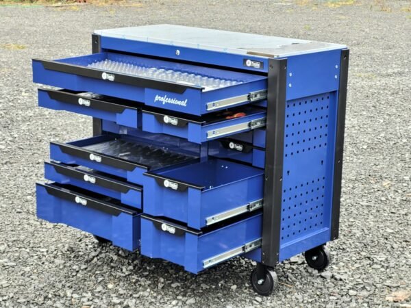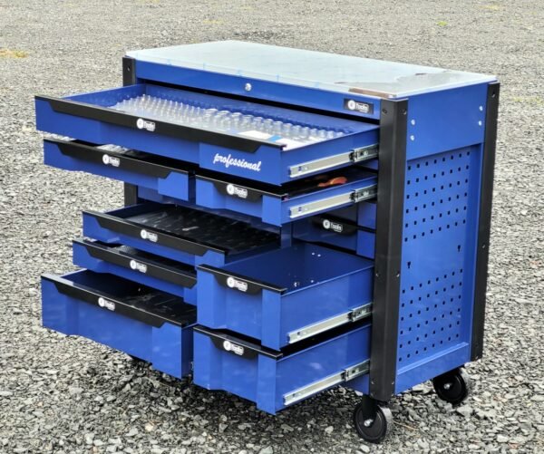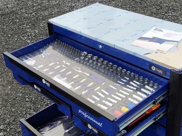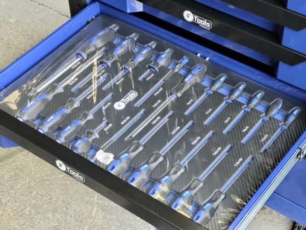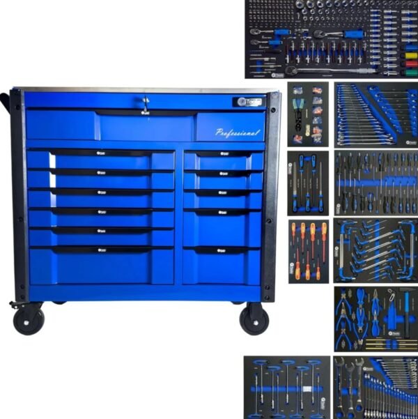 A reliable cabinet designed for auto repair shops and workshops: 12 sliding drawers, 10 already filled with tools in EVA foam inserts, and 2 empty drawers for your consumables and personal tools.