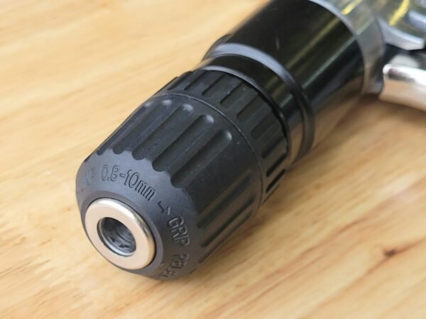 Reversible air drill with keyless chuck for fast and easy bit replacement.